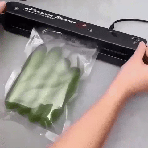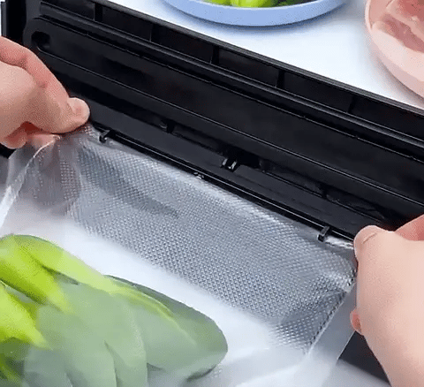 Coloca el alimento en la bolsa, alinea la boquilla en la ranura, baja la tapa y presiona el botón de sellado. En segundos queda al vacío y sellado.